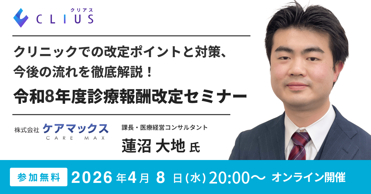 2026年(令和8年度)の診療報酬改定は、訪問診療の要件厳格化やBCPの義務化など、クリニック経営にとって大きな転換点となります。本セミナーでは、クリニックや病院の経営支援、開業コンサルティングなどを手掛ける 株式会社ケアマックス 医療経営コンサルタントの蓮沼 大地 氏 を講師にお迎えし、『【保存版】令和8年度診療報酬改定セミナー クリニックでの改定ポイントと対策、今後の流れを徹底解説』と題してお届けいたします。